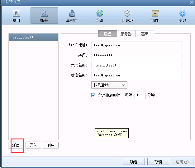 4、添加新的(de)賬号、密碼和(hé)服務器(qì)地(dì)址(服務器(qì)地(dì)址為(wèi):mail.域名)